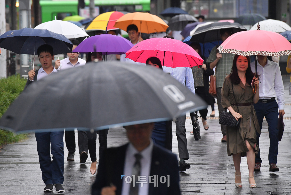 전국적으로 가을비가 내린 11일 오전 서울 여의도역 인근에서 시민들이 형형색색의 우산을 쓴 채 출근길을 재촉하고 있다. 기상청은 전국이 흐리고 비가 오다가 낮에 서쪽지방을 시작으로 저녁에는 대부분 그칠 것으로 예보했다. 이동근 기자 foto@