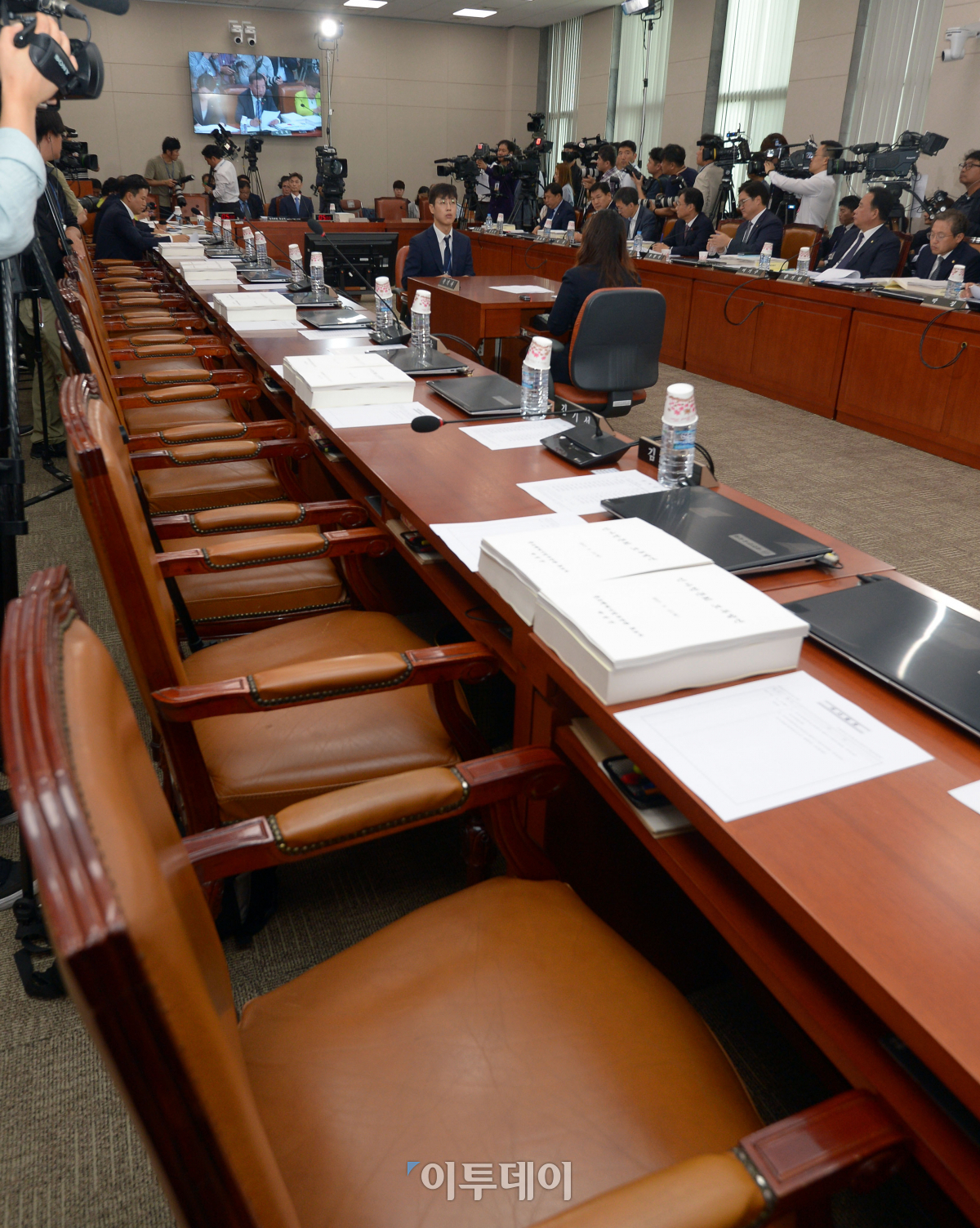 박성진 중소벤처기업부 장관 후보자의 인사청문회가 11일 오전 서울 여의도 국회에서 열린 가운데 자유한국당 의원들의 자리가 비어 있다. 이동근 기자 foto@