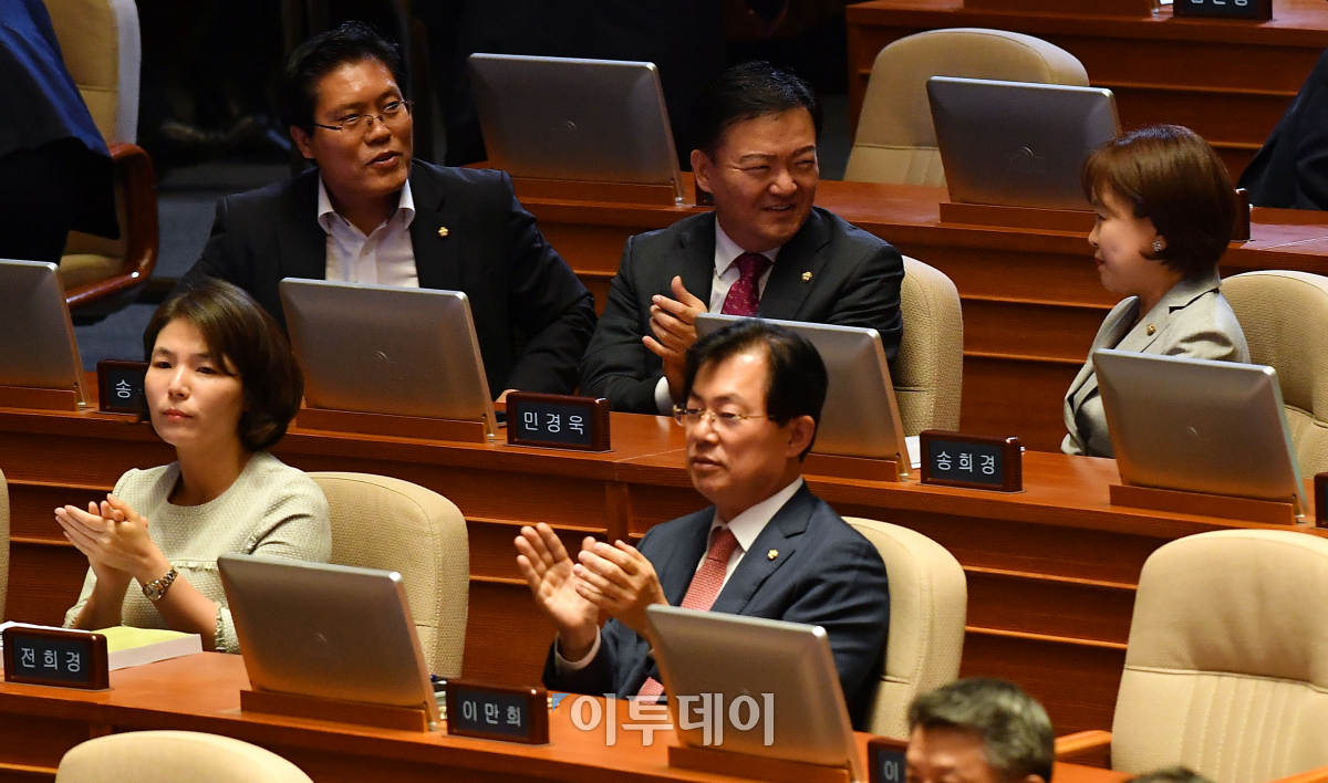자유한국당 의원들이 11일 서울 여의도 국회에서 열린 본회의에서 김이수 헌법재판소장 후보자 임명동의안이 부결되자 박수를 치며 기뻐하고 있다. 국회는 출석 의원 293명에 찬성 145, 반대 145, 기권 1, 무효 2명으로 이같이 김 후보자 인준안을 부결시켰다. 이동근 기자 foto@