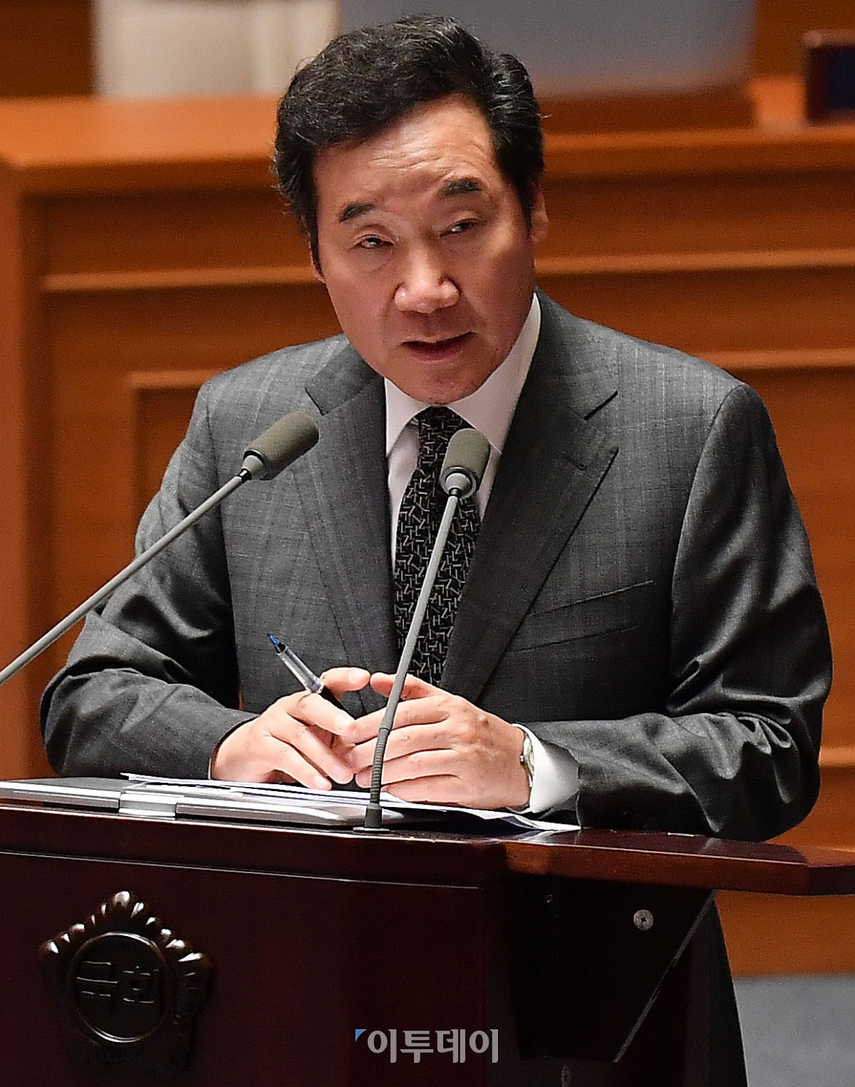 이낙연 국무총리가 11일 서울 여의도 국회에서 열린 정치분야 대정부질문에서 자유한국당 김성태 의원의 질의에 답하고 있다. 이동근 기자 foto@