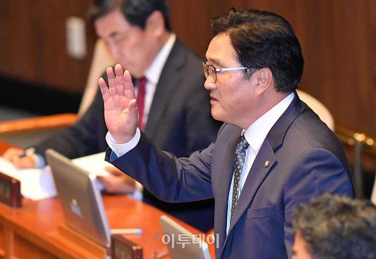 더불어민주당 우원식 원내대표가 11일 서울 여의도 국회에서 열린 본회의에서 정세균 국회의장에게 김이수 헌법재판소장 후보자 임명동의안 부결 후 정회를 요청한 여당의 요청하고 있다. 이동근 기자 foto@