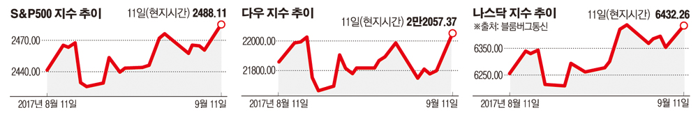 11일(현지시간) 뉴욕증시에서는 어마 세력이 약해졌단 소식에 3대 지수가 일제히 급등했다. 다우지수는 2만2057.37로 전 거래일 대비 259.89포인트(1.19%) 상승했고, S&P500지수는 26.68포인트(1.08%) 오른 2488.11을 기록하며 지난 7월 26일 기록한 사상 최고치를 갈아치웠다. 나스닥지수는 72.07포인트(1.13%) 높은 6432.26에 거래를 마쳤다.