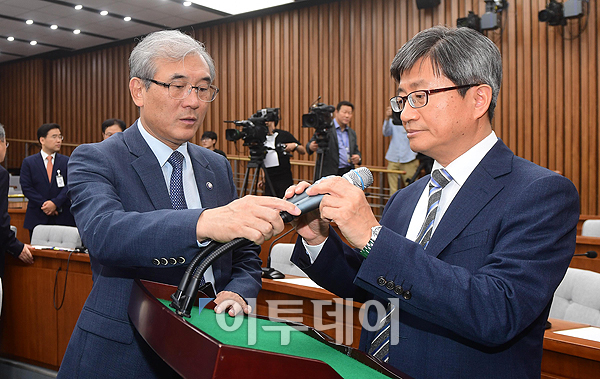 김명수 대법원장 후보자(오른쪽)가 12일 오전 서울 여의도 국회에서 인사청문회에 앞서 청문회장에서 마이크를 점검하고 있다. 고이란 기자 photoeran@