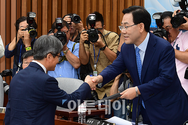 김명수 대법원장 후보자(왼쪽)가 12일 서울 여의도 국회에서 열린 인사청문회에서 주호영 위원장에게 선서문을 제출하고 있다. 고이란 기자 photoeran@