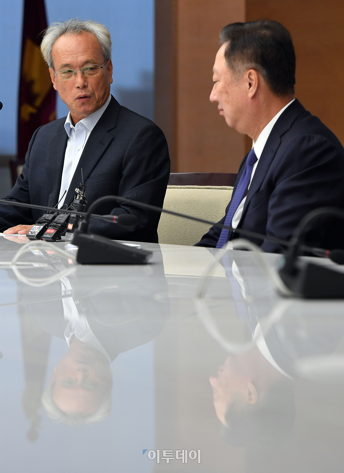 문성현 경제사회발전노사정위원장(왼쪽)이 12일 서울 중구 대한상공회의소를 방문해 박용만 대한상의 회장과 대화하고 있다. 이동근 기자 foto@