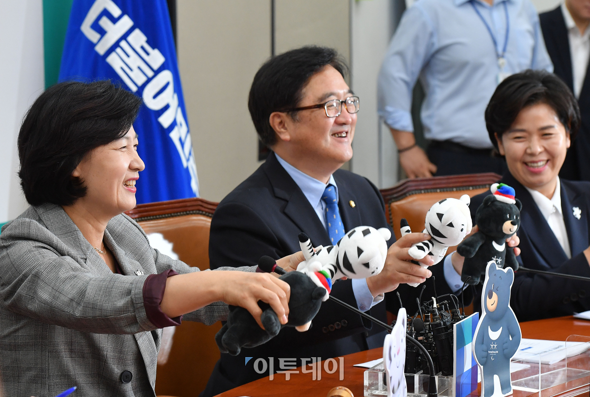 더불어민주당 추미애 대표(왼쪽)와 우원식 원내대표가 13일 오전 서울 여의도 국회에서 열린 최고위원회의에서 평창동계올림픽 마스코트 반다비, 수호랑을 들고 인사하고 있다. 이동근 기자 foto@