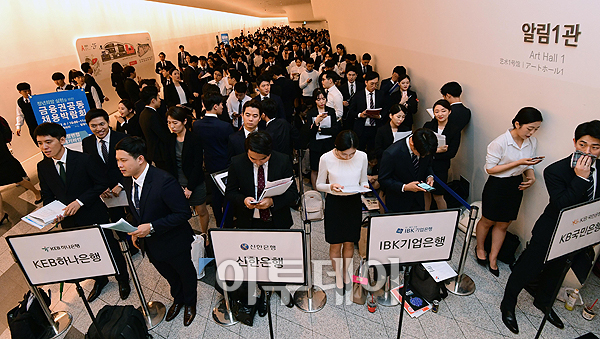 청년희망 실현을 위한 금융권 공동 채용박람회가 13일 서울 동대문 디자인플라자에서 열린 가운데 구직자들이 입구에서 길게 줄을 서고 있다. 이날 행사에는 은행, 증권사, 보험사, 카드사 및 금융공기업 등 총 52개의 금융회사가 참여했다. 고이란 기자 photoeran@