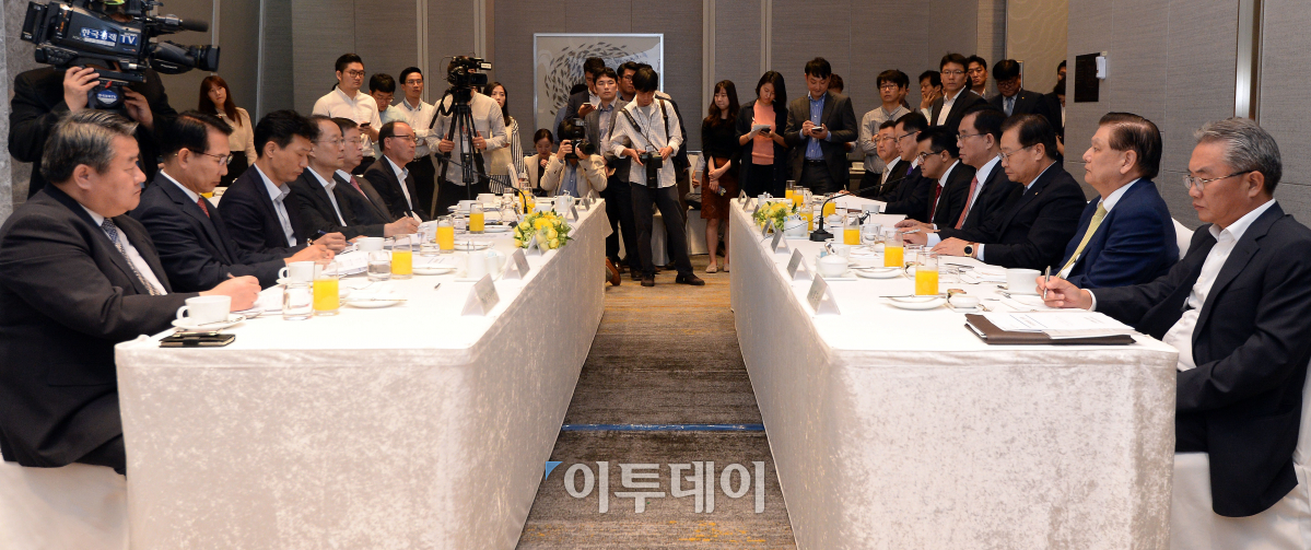 허수영 한국석유화학협회장(롯데그룹 BU장, 오른쪽에서 네 번째)이 14일 오전 서울 송파구 롯데월드타워 시그니엘에서 열린 산업부·석유화학업계 간담회에서 모두발언을 하고 있다. 이동근 기자 foto@
