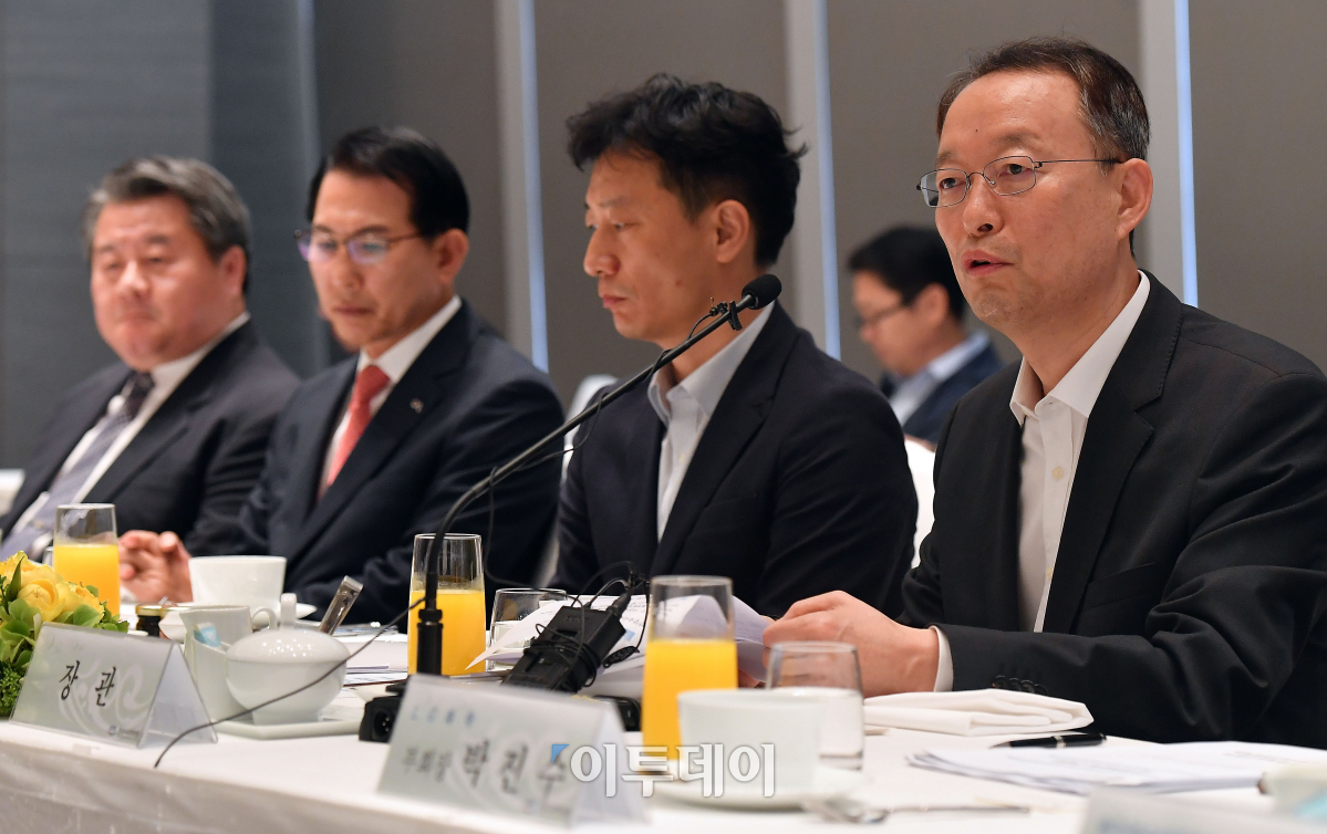 백운규 산업통상자원부 장관이 14일 오전 서울 송파구 롯데월드타워 시그니엘에서 열린 산업부·석유화학업계 간담회에서 모두발언을 하고 있다. 이동근 기자 foto@