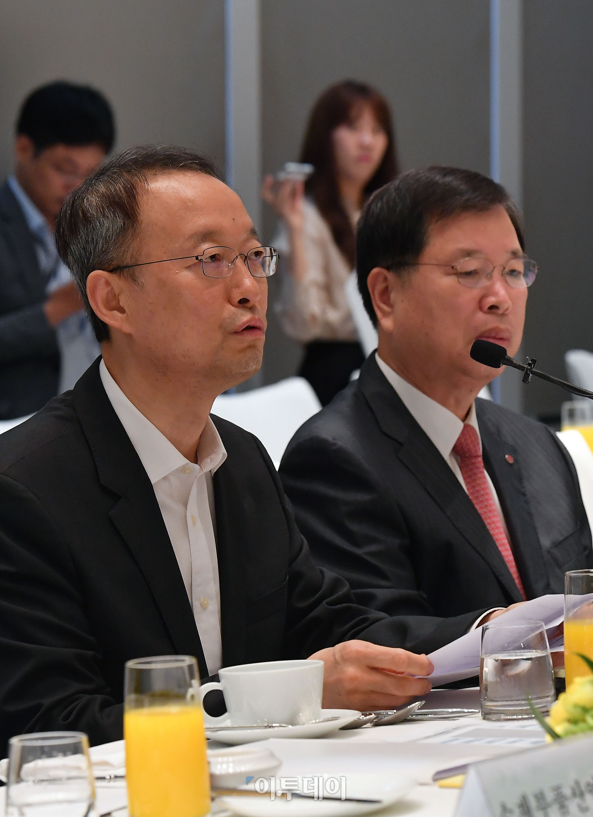 백운규 산업통상자원부 장관이 14일 오전 서울 송파구 롯데월드타워 시그니엘에서 열린 산업부·석유화학업계 간담회에서 모두발언을 하고 있다. 이동근 기자 foto@