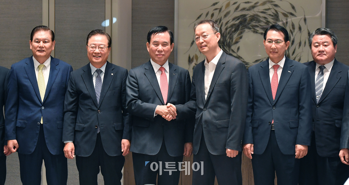백운규 산업통상자원부 장관(오른쪽에서 세 번째)과 허수영 한국석유화학협회장이 14일 오전 서울 송파구 롯데월드타워 시그니엘에서 열린 산업부·석유화학업계 간담회에서 기념촬영을 하며 악수하고 있다. 이동근 기자 foto@