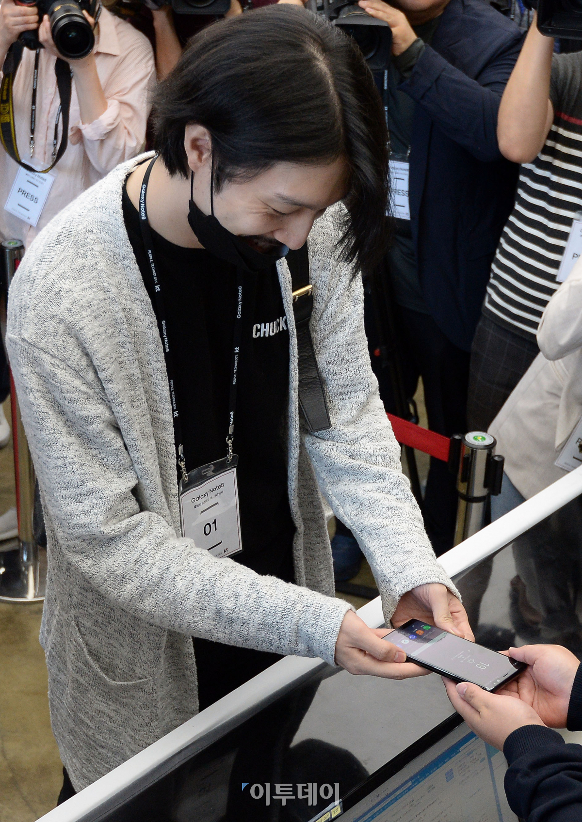 삼성전자 갤럭시노트8 출시일인 15일 오전 서울 광화문 KT스퀘어에서 1호 구매 고객인 임별(27,서울 서초구)씨가 제품을 받고 있다. 이동근 기자 foto@