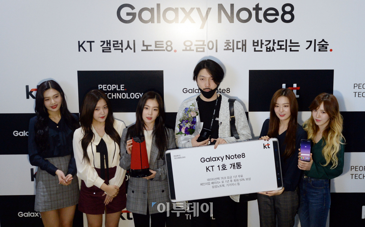 삼성전자 갤럭시노트8 출시일인 15일 오전 서울 광화문 KT스퀘어에서 1호 개통자 임별(27, 서울 서초구)씨와 레드벨벳이 기념촬영을 하고 있다. 이동근 기자 foto@