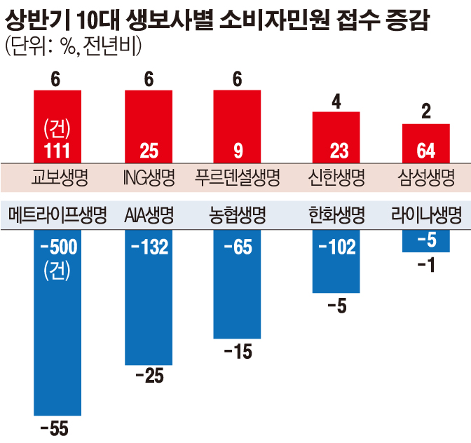 감소율이 가장 큰 생보사는 메트라이프생명이었다. 올 상반기 접수 민원은 411건으로 지난해 같은 911건보다 절반 이상 줄었다. 이어 AIA생명(-25%), 농협생명(-15%), 한화생명(-5%), 라이나생명(-1%) 등 순이었다.