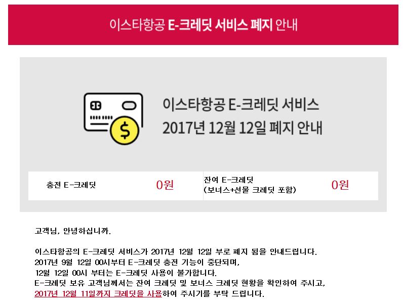 이스타항공에 따르면 2017년 12월 12일 부로 E-크레딧 서비스가 폐지된다. 이에 따라 E-크레딧 사용이 불가능하며, E-크레딧 충전 기능도 중단됐다.