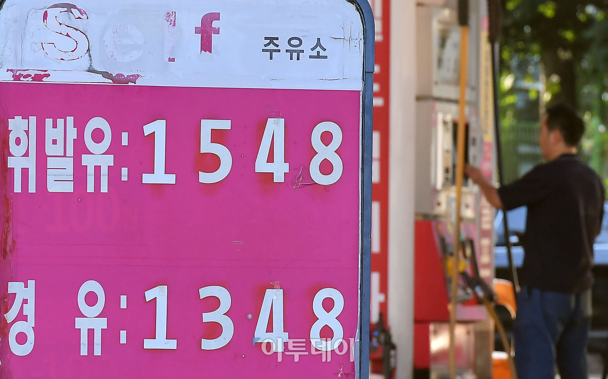 전국 평균 휘발유 가격이 7주 연속 상승한 가운데 18일 오전 서울 양천구의 한 주유소의 휘발유 가격이 리터당 1548원을 나타내고 있다. 유가정보시스템 오피넷에 따르면 8월 원유 생산 감소 등 국제유가 상승의 영향으로 전주 대비 8.8원 오른 1475.1원/ℓ로 8월 첫주 반등한 이후 7주 연속 상승했다. 이동근 기자 foto@