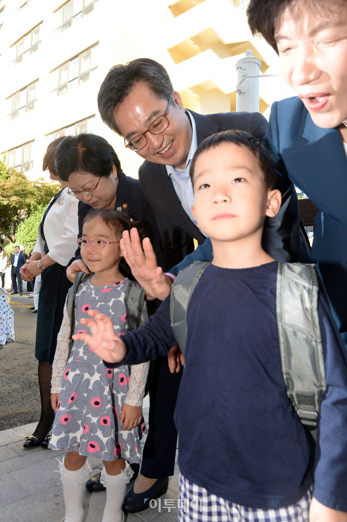 김동연 경제부총리 겸 기획재정부 장관(뒷줄 가운데)과 김영주 고용노동부 장관(뒷줄 오른쪽), 정현백 여성가족부 장관이 18일 오전 '저출산 대응과 여성 경제활동 참여 확대'를 위한 관계 부처 합동 현장방문 차 서울 구로구청 내 어린이집을 방문해 등원하는 아이들을 맞이하고 있다. 이동근 기자 foto@