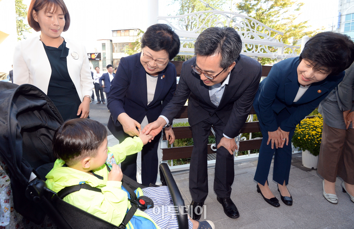 김동연 경제부총리 겸 기획재정부 장관(오른쪽에서 두 번째)과 김영주 고용노동부 장관(오른쪽), 정현백 여성가족부 장관이 18일 오전 '저출산 대응과 여성 경제활동 참여 확대'를 위한 관계 부처 합동 현장방문 차 서울 구로구청 내 어린이집을 방문해 등원하는 아이들을 맞이하고 있다. 이동근 기자 foto@