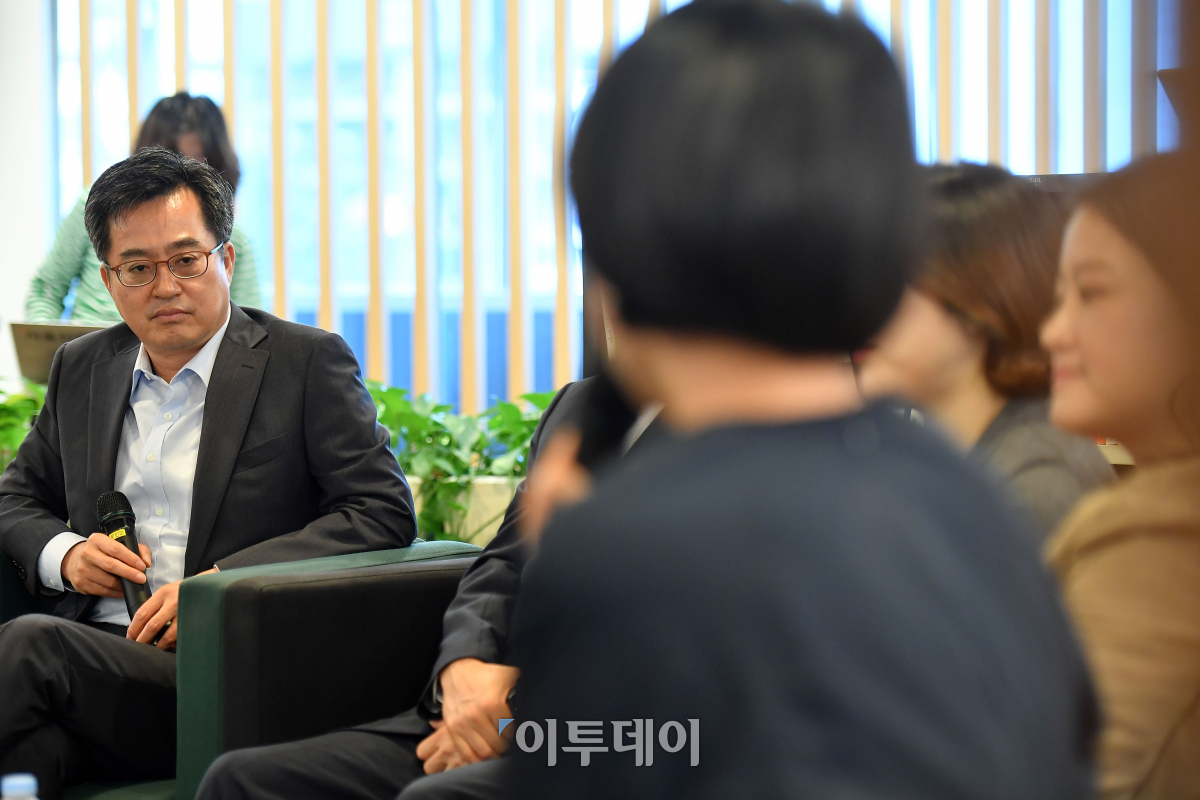 김동연 경제부총리 겸 기획재정부 장관(왼쪽)이 18일 여성고용 친화 제도를 운영중인 서울 중구 신한은행 본점을 방문해 '일·생활 균형, 일하며 아이를 키울 수 있는 여건 조성' 등을 주제로 경영진 및 여직원들과 대화하고 있다. 신한은행은 시간선택제, 임신기 근로시간 단축, 유연근무를 위한 스마트워킹센터 운영 등을 통해 2013년 가족친화기업으로 인증받았다. 이동근 기자 foto@