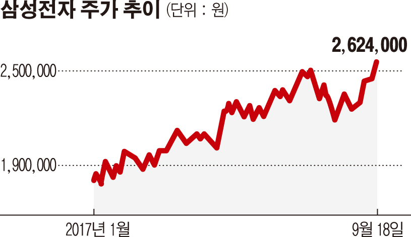 기대치를 상회하는 반도체 업황에 정부 주도의 대규모 투자 계획까지 겹치며 주가는 고공행진했다. 삼성전자 주가는 이날 전날보다 4.13% 오른 262만4000원에 거래를 마쳤다. 이는 지난 7월 기록한 종가 기준 사상 최고가 256만 원을 넘어선 것이다.