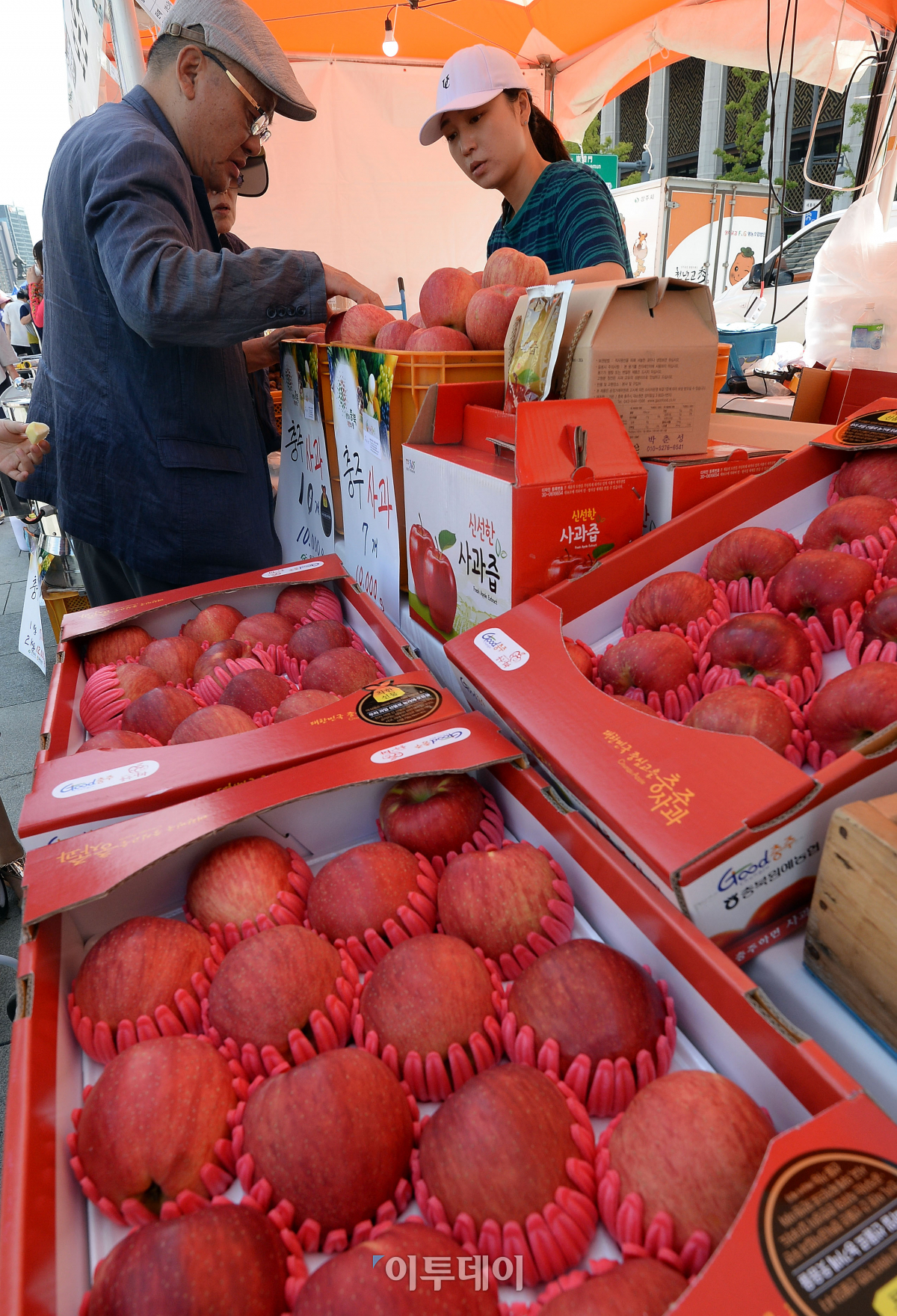 추석맞이 농축산물 직거래장터가 18일 서울 광화문광장에서 열린 가운데 시민들이 과일을 고르고 있다. 추석을 맞아 오는 20일까지 열리는 이번 행사는 전국 78개 지자체와 51개 생산자단체가 참여해 시중 가격보다 할인된 가격으로 판매한다. 이동근 기자 foto@