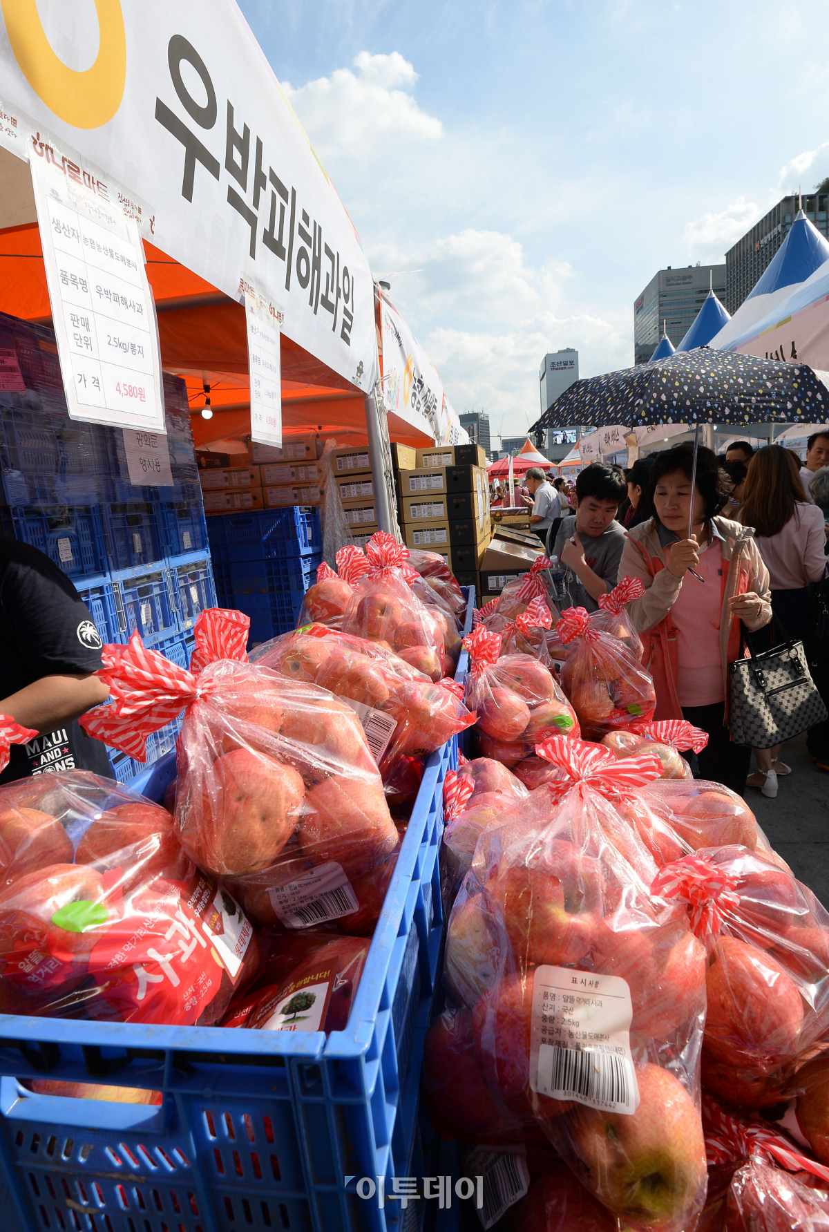 추석맞이 농축산물 직거래장터가 18일 서울 광화문광장에서 열린 가운데 시민들이 과일을 고르고 있다. 추석을 맞아 오는 20일까지 열리는 이번 행사는 전국 78개 지자체와 51개 생산자단체가 참여해 시중 가격보다 할인된 가격으로 판매한다. 이동근 기자 foto@