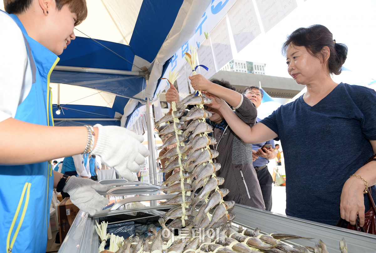 추석맞이 농축산물 직거래장터가 18일 서울 광화문광장에서 열린 가운데 시민들이 굴비를 고르고 있다. 추석을 맞아 오는 20일까지 열리는 이번 행사는 전국 78개 지자체와 51개 생산자단체가 참여해 시중 가격보다 할인된 가격으로 판매한다. 이동근 기자 foto@