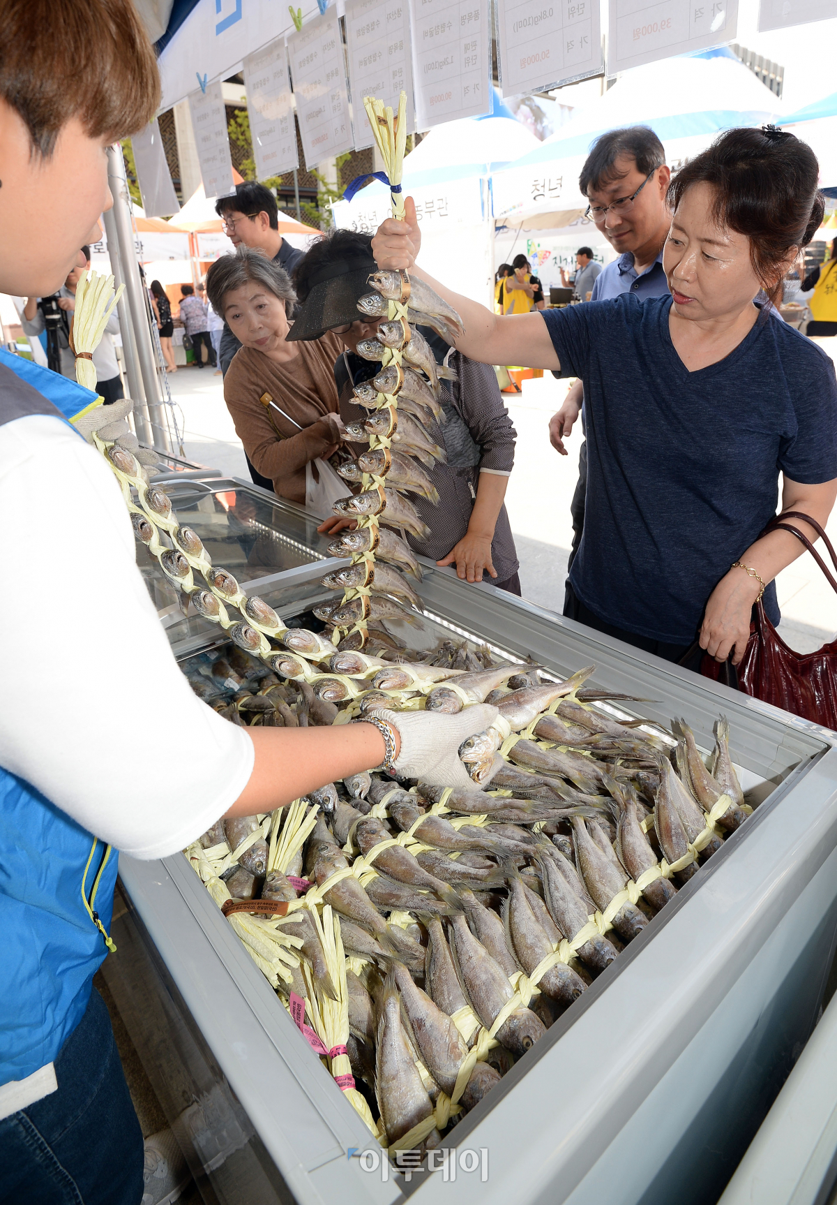 추석맞이 농축산물 직거래장터가 18일 서울 광화문광장에서 열린 가운데 시민들이 굴비를 고르고 있다. 추석을 맞아 오는 20일까지 열리는 이번 행사는 전국 78개 지자체와 51개 생산자단체가 참여해 시중 가격보다 할인된 가격으로 판매한다. 이동근 기자 foto@