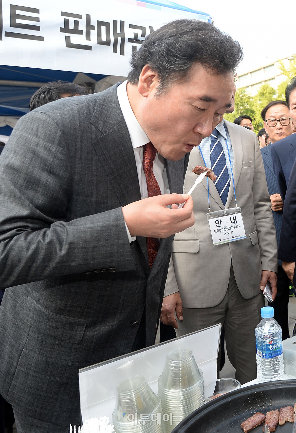 추석맞이 농축산물 직거래장터가 18일 서울 광화문광장에서 열린 가운데 이낙연 국무총리가 한우 시식을 하고 있다. 추석을 맞아 오는 20일까지 열리는 이번 행사는 전국 78개 지자체와 51개 생산자단체가 참여해 시중 가격보다 할인된 가격으로 판매한다. 이동근 기자 foto@