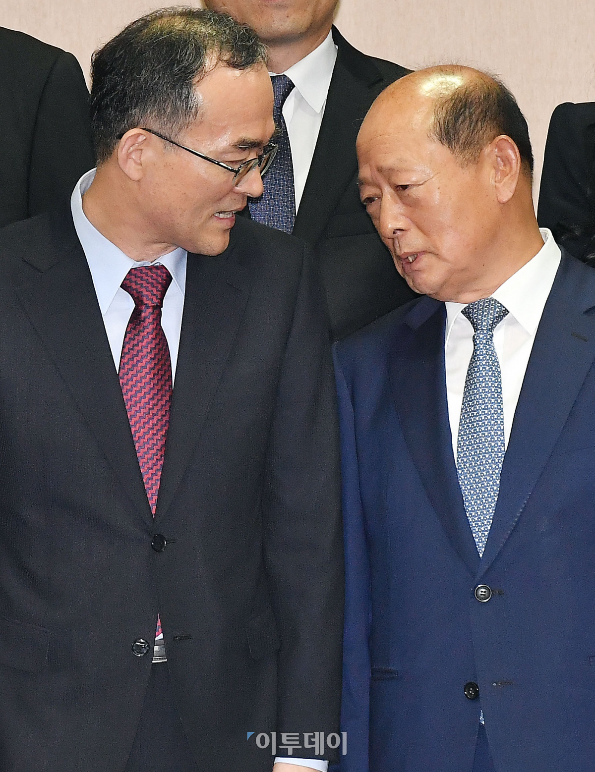문무일 검찰총장(왼쪽)과 송두환 검찰개혁위원장이 19일 서울 서초구 대검찰청에서 열린 위원회 발족식에서 기념촬영을 하며 대화하고 있다. 이동근 기자 foto@
