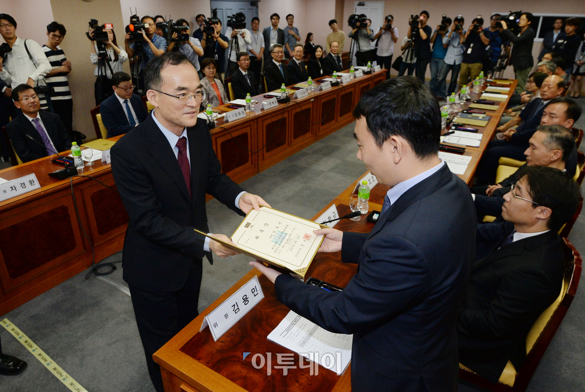 문무일 검찰총장(왼쪽)이 19일 서울 서초구 대검찰청에서 열린 검찰개혁위원회 발족식에서 위원들에게 위촉장을 전달하고 있다. 이동근 기자 foto@