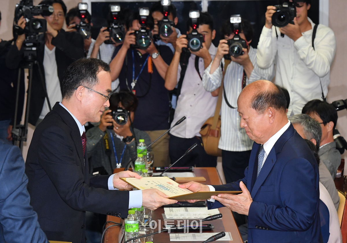 문무일 검찰총장(왼쪽)이 19일 서울 서초구 대검찰청에서 열린 검찰개혁위원회 발족식에서 송두환 위원장에게 위촉장을 전달하고 있다. 이동근 기자 foto@