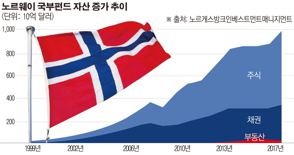 인구 5200만 명의 노르웨이는 1996년 석유자원으로 얻은 수입을 바탕으로 자국 미래세대를 위해 국부펀드를 출범시켰다. 영국 파이낸셜타임스(FT)는 외부 리스크와 변수 등으로 펀드 성장 속도는 일정하지는 않았으나 2002년 이후 펀드 평가 자산은 13배 증가했다고 전했다. 노르웨이 국부펀드보다 체급이 높은 것은 세계 최대 연기금인 일본 후생연금펀드(GPIF·약 1조3000억 달러), 중국 외환보유고(약 3조 달러), 민간 투자운용사로는 블랙록(약 5조7000억 달러), 뱅가드그룹(약 4조4000억 달러) 등이 손꼽힐 정도로 규모 면에서는 타의 추종을 불허한다. 이 펀드를 운용하는 NBIM는 노르웨이, 미국, 영국, 중국, 싱가포르 4곳에서 지사를 운영하고 있으며 전체 550여 명의 인력을 두고 있다. 관리비용은 전체 자산의 0.02% 정도로 이마저도 5년 전(0.07%)보다 줄어들었다.