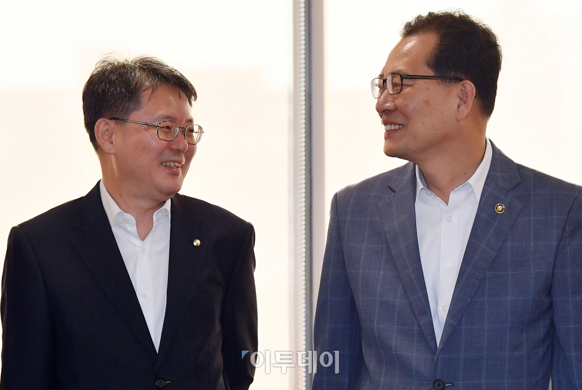 고형권 기획재정부 1차관(오른쪽)과 윤면식 한국은행 부총재가 21일 오전 서울 중구 은행회관에서 열린 제53차 거시경제금융회의에서 대화하고 있다. 이동근기자 foto@