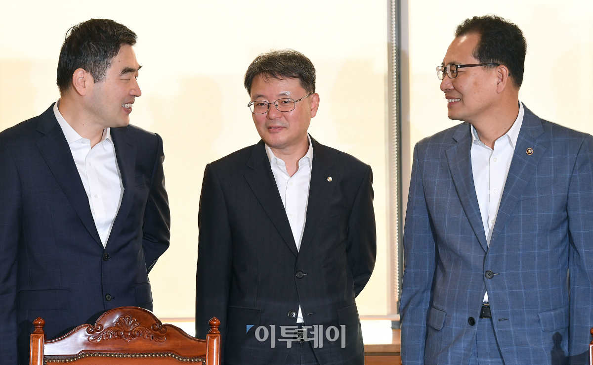 고형권 기획재정부 1차관, 윤면식 한국은행 부총재, 정규돈 국제금융센터 원장(오른쪽부터)이 21일 오전 서울 중구 은행회관에서 열린 제53차 거시경제금융회의에서 대화하고 있다. 이동근기자 foto@