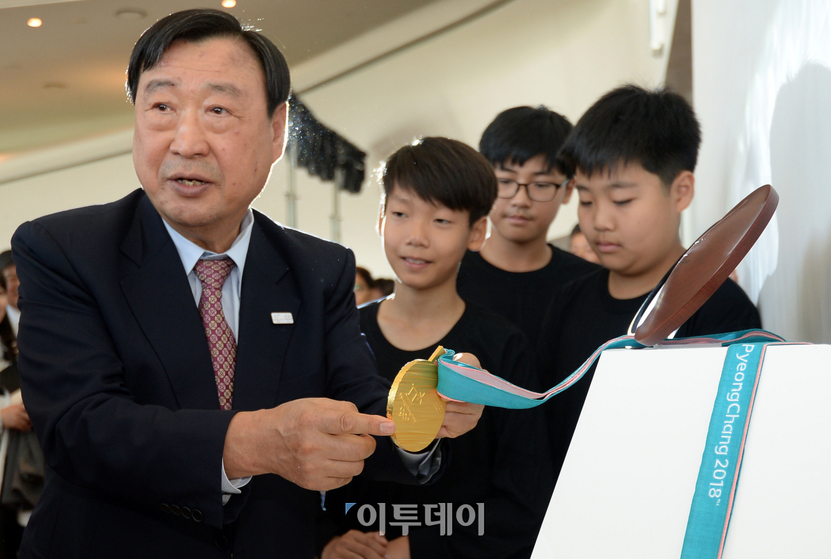 이희범 평창올림픽 조직위원장이 21일 오전 서울 중구 동대문디자인플라자에서 열린 2018 평창 동계올림픽대회 메달 발표회에서 메달을 선보이고 있다. '한글'을 모티브로 제작된 메달의 측면엔 '평창동계올림픽이공일팔'의 자음인 'ㅍㅇㅊㅇㄷㅇㄱㅇㄹㄹㅁㅍㄱㅇㄱㅇㅇㄹㅍㄹ'을 새겨 입체적으로 구성했다. 이동근 기자 foto@