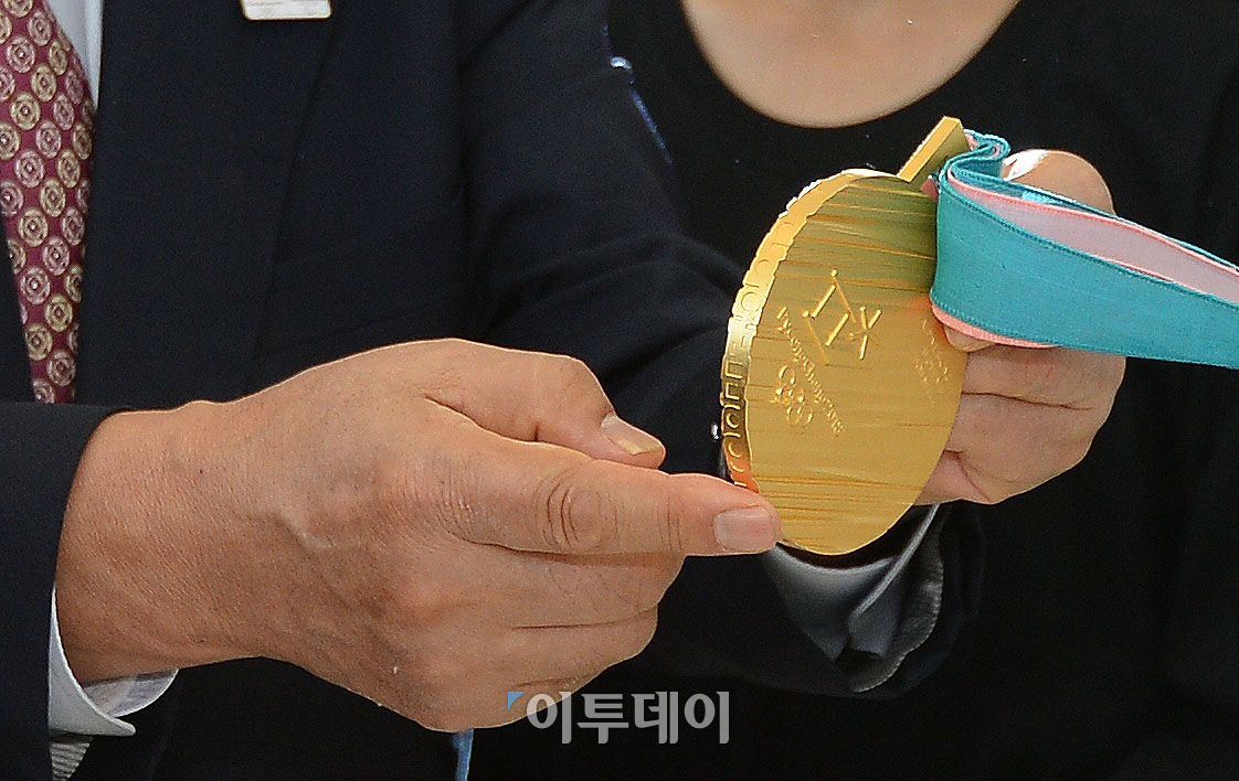 이희범 평창올림픽 조직위원장이 21일 오전 서울 중구 동대문디자인플라자에서 열린 2018 평창 동계올림픽대회 메달 발표회에서 메달을 선보이고 있다. '한글'을 모티브로 제작된 메달의 측면엔 '평창동계올림픽이공일팔'의 자음인 'ㅍㅇㅊㅇㄷㅇㄱㅇㄹㄹㅁㅍㄱㅇㄱㅇㅇㄹㅍㄹ'을 새겨 입체적으로 구성했다. 이동근 기자 foto@