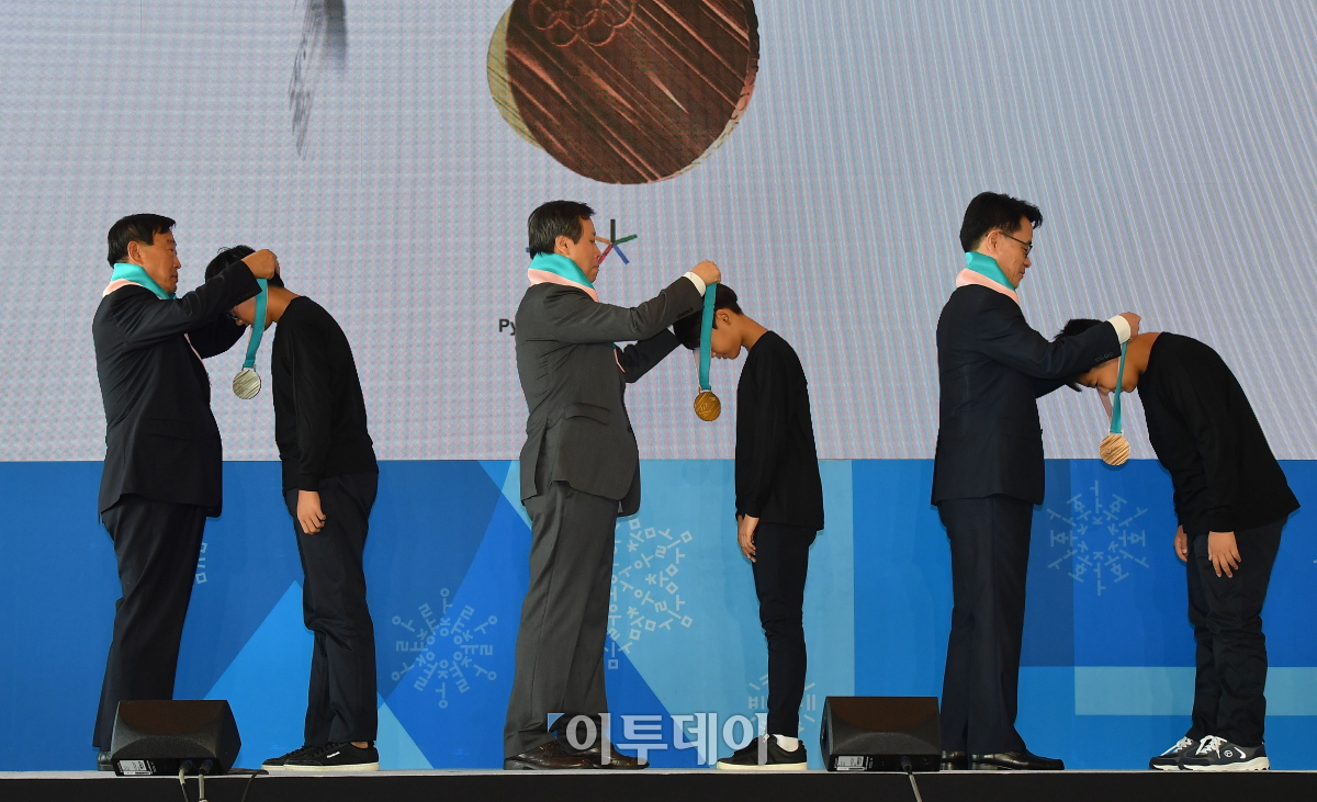 이희범 평창올림픽 조직위원장(왼쪽), 도종환 문화체육관광부 장관(왼쪽에서 세 번째), 송석두 강원도 행정부지사(왼쪽에서 다섯 번째)가 21일 오전 서울 중구 동대문디자인플라자에서 열린 2018 평창 동계올림픽대회 메달 발표회에서 동계스포츠 꿈나무들에게 실물 메달을 목에 걸어주고 있다. '한글'을 모티브로 제작된 메달의 측면엔 '평창동계올림픽이공일팔'의 자음인 'ㅍㅇㅊㅇㄷㅇㄱㅇㄹㄹㅁㅍㄱㅇㄱㅇㅇㄹㅍㄹ'을 새겨 입체적으로 구성했다. 이동근 기자 foto@