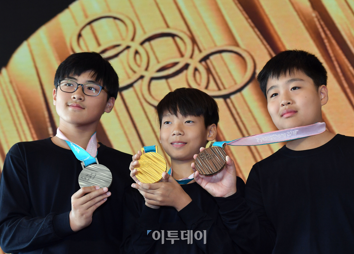 21일 오전 서울 중구 동대문디자인플라자에서 열린 2018 평창 동계올림픽대회 메달 발표회에서 동계스포츠 꿈나무들이 실물 메달을 선보이고 있다. '한글'을 모티브로 제작된 메달의 측면엔 '평창동계올림픽이공일팔'의 자음인 'ㅍㅇㅊㅇㄷㅇㄱㅇㄹㄹㅁㅍㄱㅇㄱㅇㅇㄹㅍㄹ'을 새겨 입체적으로 구성했다. 이동근 기자 foto@