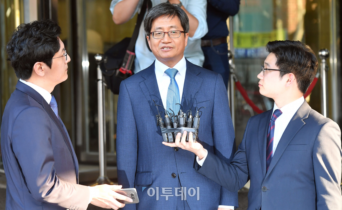 국회 임명동의안이 통과된 김명수 대법원장 후보자가 21일 서울 서초구 사법발전재단에 마련된 사무실을 나서며 소감을 밝히고 있다. 이동근 기자 foto@