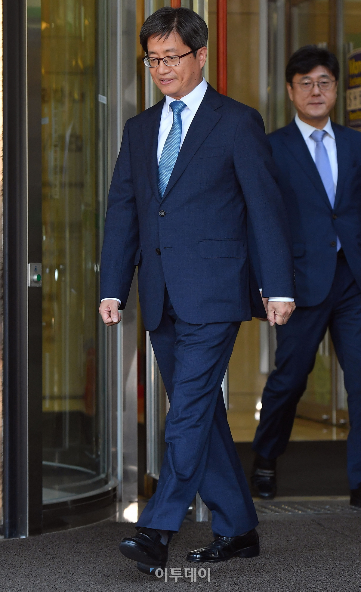 국회 임명동의안이 통과된 김명수 대법원장 후보자가 21일 서울 서초구 사법발전재단에 마련된 사무실을 나서고 있다. 이동근 기자 foto@