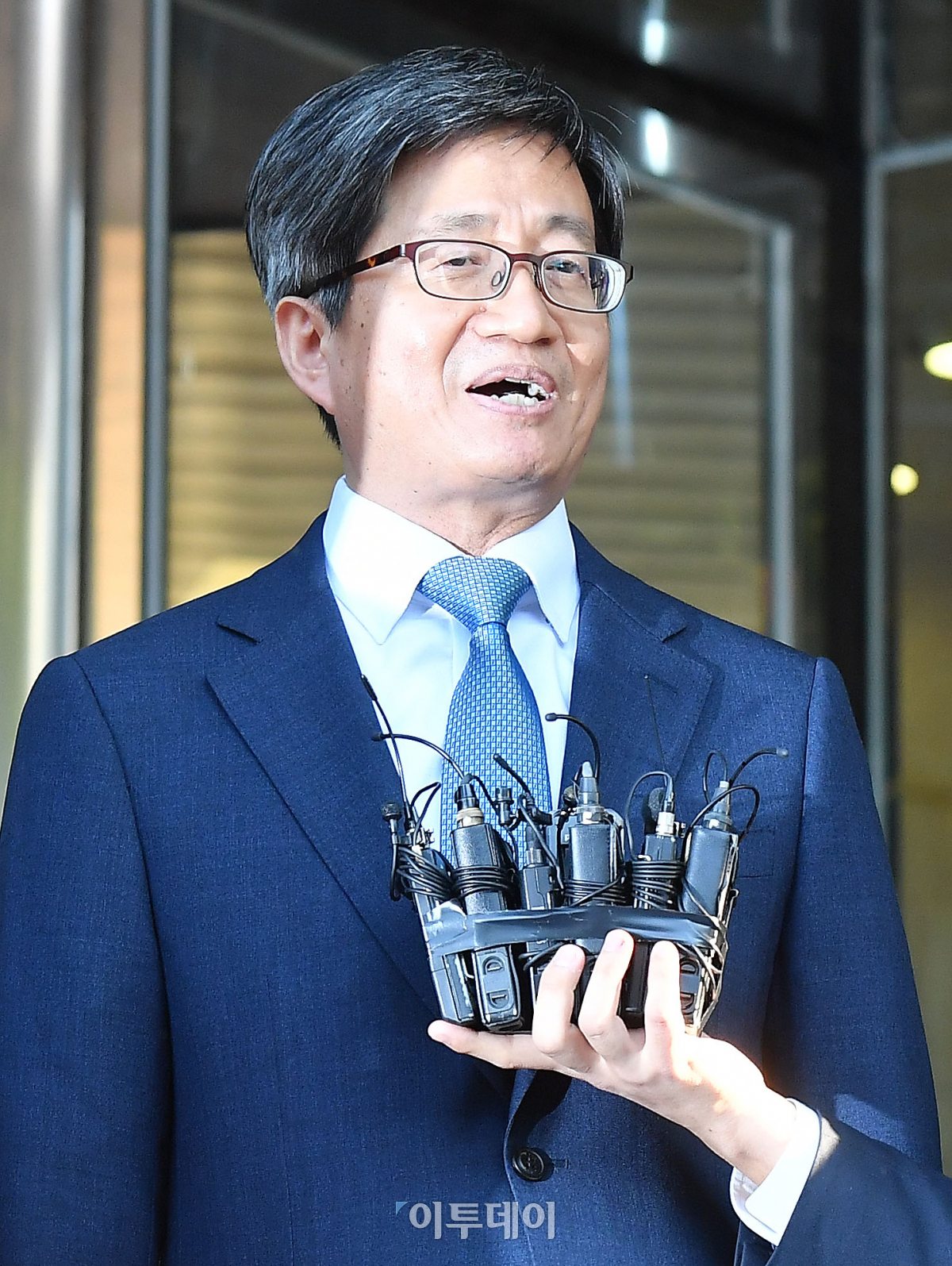 국회 임명동의안이 통과된 김명수 대법원장 후보자가 21일 서울 서초구 사법발전재단에 마련된 사무실을 나서며 소감을 밝히고 있다. 이동근 기자 foto@