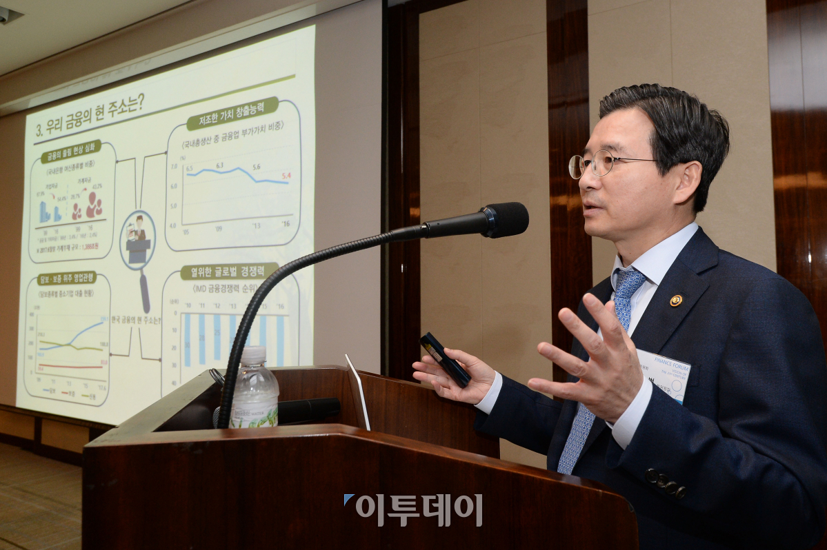 김용범 금융위원회 부위원장이 22일 오전 서울 중구 웨스틴조선호텔에서 열린 21세기 금융비전포럼에서 '생산적 금융과 포용적 금융'을 주제로 강연하고 있다. 이동근 기자 foto@