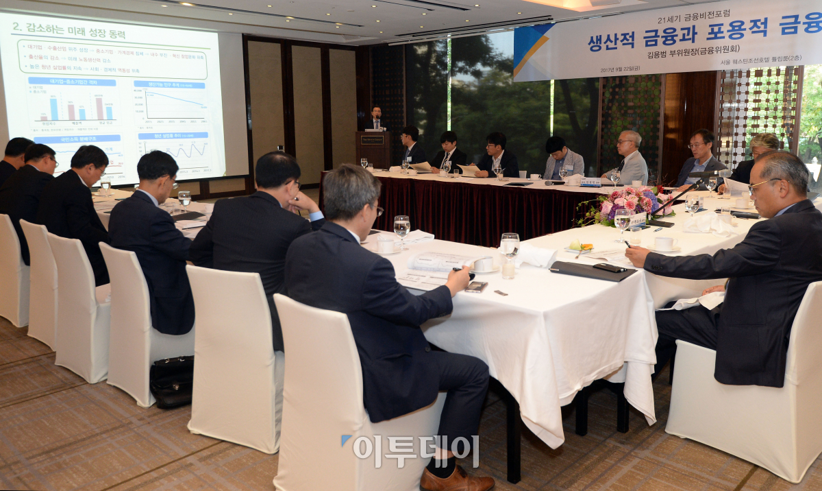 김용범 금융위원회 부위원장이 22일 오전 서울 중구 웨스틴조선호텔에서 열린 21세기 금융비전포럼에서 '생산적 금융과 포용적 금융'을 주제로 강연하고 있다. 이동근 기자 foto@