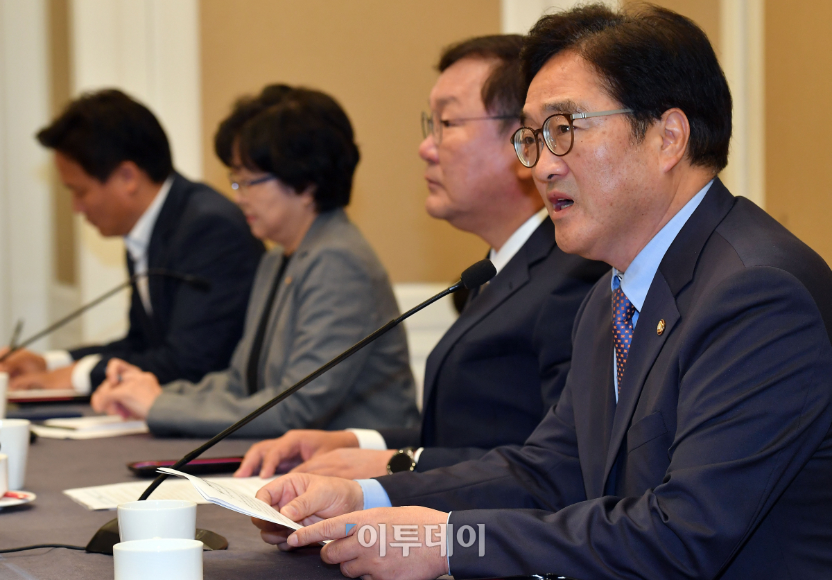 더불어민주당 우원식 원내대표(오른쪽)가 25일 오전 서울 여의도 국회에서 열린 미세먼지 대책 당정협의에서 모두발언을 하고 있다. 이동근 기자 foto@