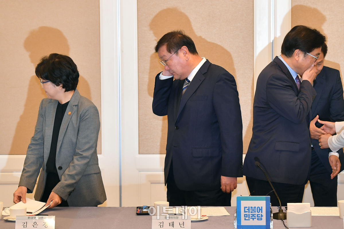 김은경 환경부 장관, 더불어민주당 김태년 정책위의장, 우원식 원내대표(왼쪽부터)가 25일 오전 서울 여의도 국회에서 열린 미세먼지 대책 당정협의에서 기념촬영을 마치고 자리로 향하고 있다. 이동근 기자 foto@