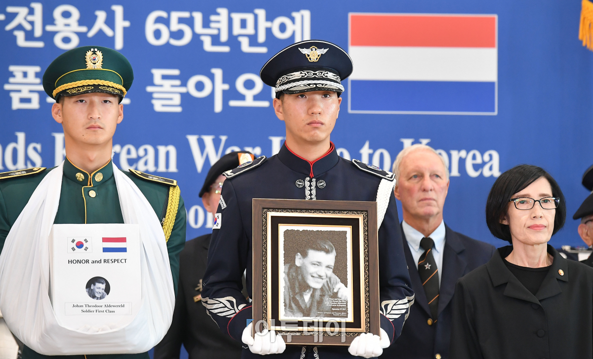 6·25전쟁에 유엔군으로 참전한 네덜란드 참전용사 故(고) 요한 테오도르 알데베렐트씨의 유해가 25일 오후 인천공항을 통해 봉환되고 있다. 고 알데베렐트씨는 네덜란드 참전협회에 자신의 유해를 동료들이 잠들어 있는 대한민국 땅에 묻어달라는 유언을 남긴 채 지난 2월 4일 향년 88세로 세상을 떠났다. 이동근 기자 foto@