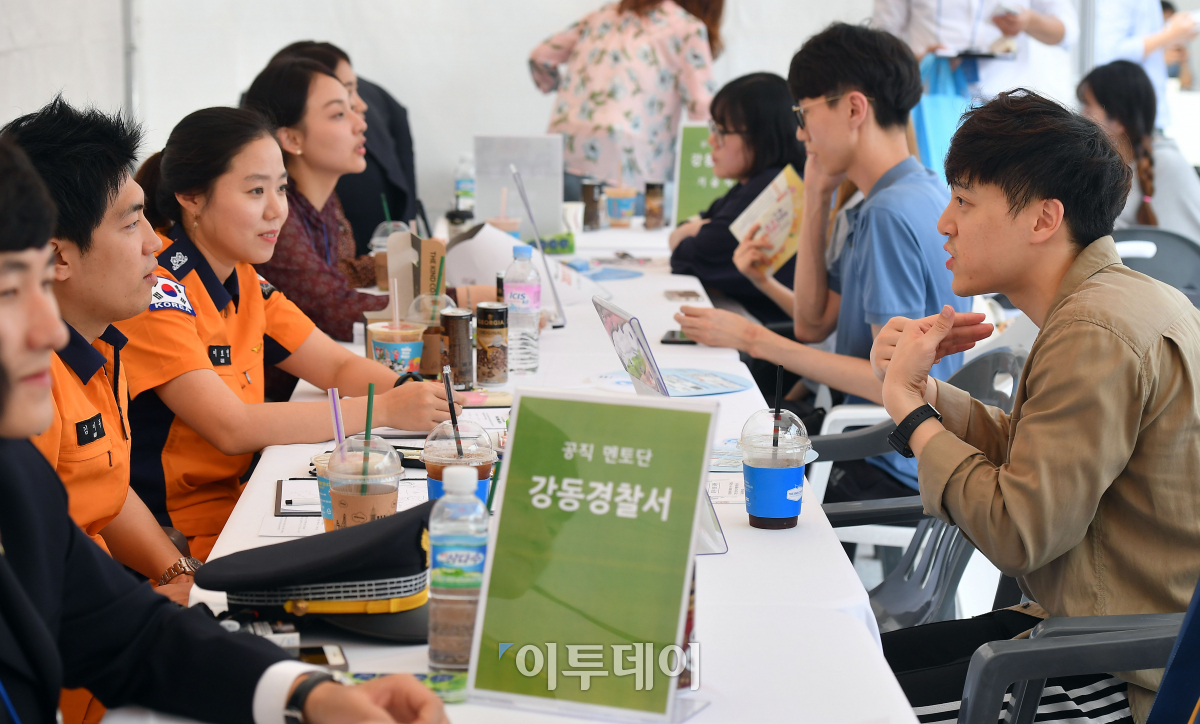 2017 강동 취업박람회가 26일 서울 강동구청 앞마당에서 열린 가운데 공무원 준비생들이 현직 공무원들에게 '공시생멘토링'을 받고 있다. 이번 박람회는 구인·구직 연계와 일자리 정보 공유 등을 통해 지역 경제 어려움을 해소하고 일자리 복지 향상을 도모하기 위해 열렸다. 이동근 기자 foto@