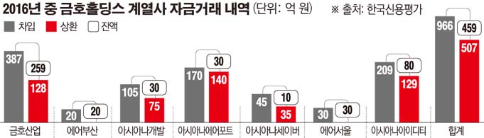 특히 지난해 말 기준 금호홀딩스의 차입금 규모는 1조633억 원으로 올해 6월 마무리된 금호고속 인수 과정에서 더 늘어났을 것으로 관측된다. 때문에 계열사의 도움 없이는 이자비용도 감당하기 어려운 상황으로 분석되고 있다.
