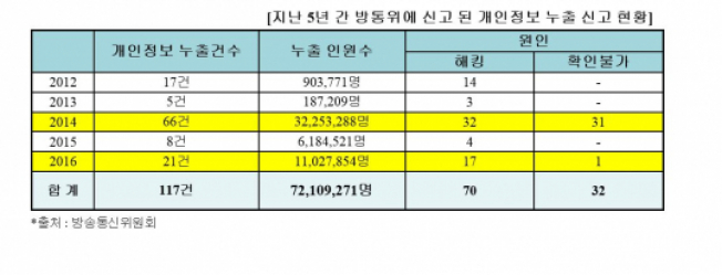 특히 지난 5년 간 접수된 117건의 개인정보유출 문제의 원인을 보면, 해킹이 70건으로 무려 60%를 차지했다. 그리고 개인정보가 몇 명이 유출되었는지조차 알 수 없는 “확인불가”가 27%를 차지하고 있어, 이를 고려한 경우 개인정보유출 인원은 훨씬 더 늘어날 것이라는 주장이다.